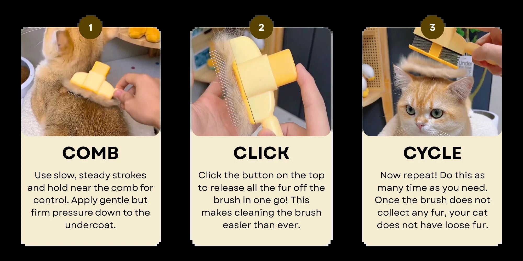 The ZenBrush™ is designed to gently remove only the loose fur — nothing more. It safely removes up to 95% of all loose hair without tugging, pulling, or scratching your cat’s skin. If you don’t see a lot of fur on the brush after use, it simply means your cat doesn’t have much loose fur that needs to come out — and that’s a good thing. Unlike traditional brushes that yank out healthy hair and irritate the skin (which is why so many cats resist brushing), the ZenBrush targets only what’s ready to shed. For best results, make several slow, steady passes and consider holding the brush closer to the comb for better control. Apply gentle but firm pressure and brush all the way through to the undercoat.